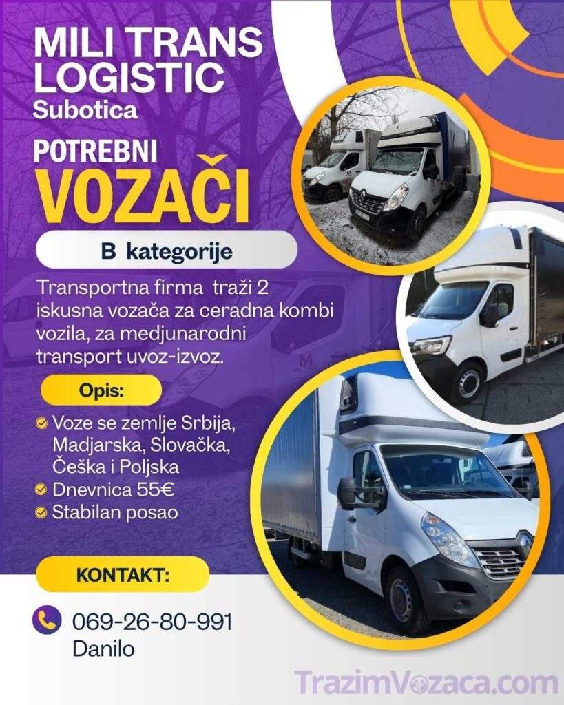 Transportna firma Danilo Milikić PR Mili Trans Logistic iz Subotice traži 2 vozača ,sa medjunarodnim transportnim iskustvom, za ceradna kombi vozila sa B kategorijom, važećim lekarskim pregledom i putnim osiguranjem za međunarodni transport IZVOZ-UVOZ
