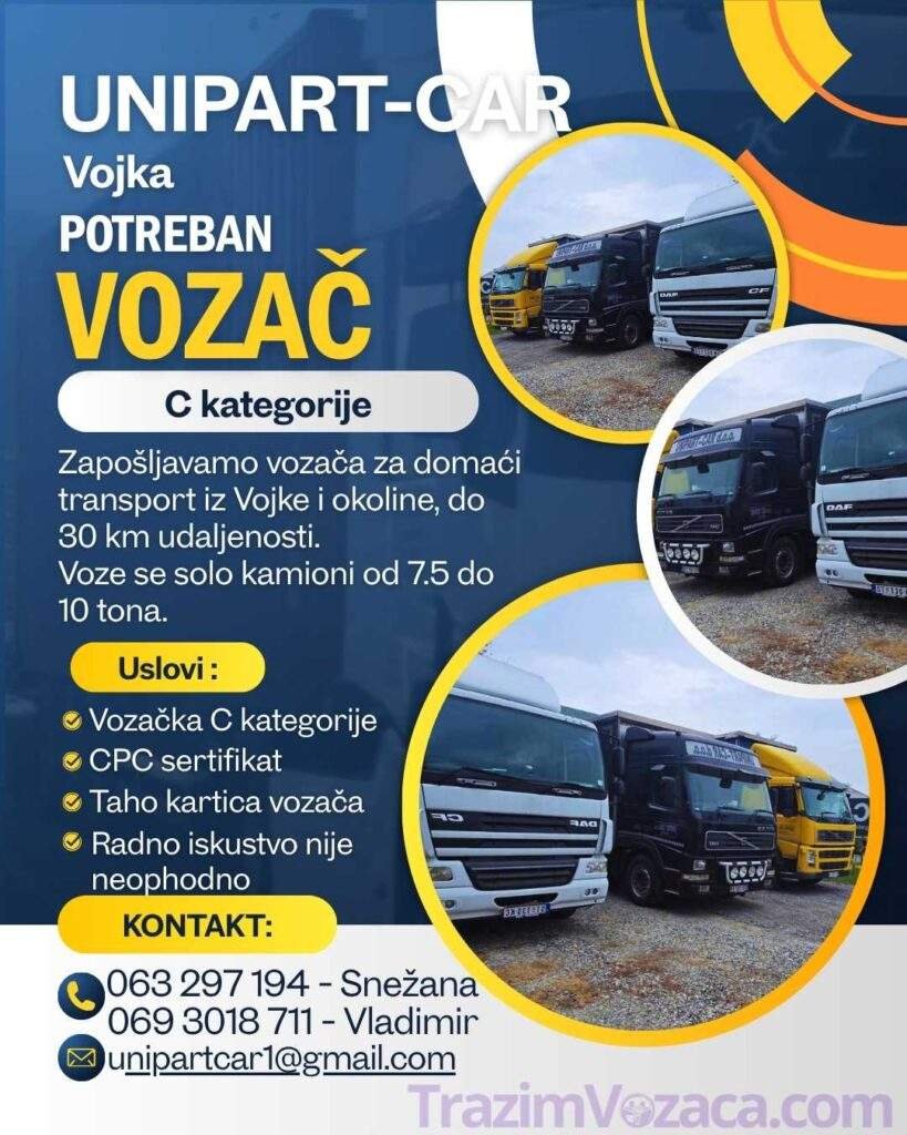 Zapošljavamo vozača C kategorije za rad u domaćem transportu iz Vojke,i okoline udaljenosti do 30km. Vožnja se obavlja solo kamionima nosivosti od 7,5 do 10 tona.